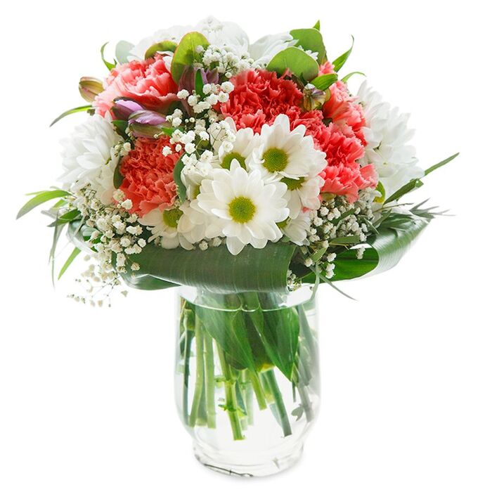 There's an effervescent delight woven through this Northolt bouquet: lush clusters of coral and peach carnations with playful, ruffled petals illuminate the arrangement like sunrise over the greens of Rectory Park. Creamy white daisies, their golden-green centers shining, stand in cheerful contrast, evoking happy gatherings and the openness of local Northolt gardens. Wispy baby's breath drifts between the flowers, its tiny blossoms lending an innocent, floating softness-almost like laughter carried on a gentle spring breeze. Fresh, deep green leaves arc gracefully around the base, creating a natural cradle for the vibrant blooms, while a few tightly closed buds kissed with purple tucked to the side add mystery and expectation. All this beauty is cradled upright in a pristine square white bag, complete with sleek white ribbon handles, ready for quick local delivery or to be presented with pride at a celebration or as a spontaneous token of care. Every detail is thoughtfully curated by Northolt's local florists, their craftsmanship evident in the full, balanced shape and harmonious composition. The image celebrates not just flowers, but the shared joy of community, the comfort of tradition, and the hope that accompanies a fresh bouquet arriving at your Northolt doorstep. This exuberant bouquet, inspired by the fresh energy of Northolt's vibrant community, features crisp white daisies with lively green centres and plush coral-pink carnations arrayed in a flawless circle. Sprigs of ethereal gypsophila weave throughout, echoing the soft, starry shapes seen in the hedgerows along Mandeville Road during spring. Delicate buds-alstroemeria with hints of blush and violet-peek out from a backdrop of silvery eucalyptus and deep green leaves, adding both intrigue and harmony to the design. Every element is arranged to radiate warmth and delight, capturing the sensation of sunlight streaming through the windows of a Northolt home. The careful craftsmanship and rich textures invite an immersive experience-the heady freshness of the florals, the feathery softness of the greenery-all combining to evoke a sense of hope and gentle celebration. This bouquet is ideal for marking a birthday, sending uplifting wishes, or simply bringing a breath of spring into daily life across Northolt, reflecting the sophistication and care of the area's experienced local florists. Captured against a radiant white background, this bouquet offers a burst of joyful colour that feels at home in Northolt-almost as if gathered after a morning spent wandering through Marnham Fields. Dense, coral-pink carnations with delicate ruffles stand in energetic clusters, whilst snowy white daisies and chrysanthemums open wide, adding an uplifting and sincere brightness. The arrangement is softened by clouds of baby's breath-tiny, star-like florets that infuse the ensemble with gentle airiness and warmth. Closed magenta alstroemeria buds peek shyly from the edge, introducing a subtle variation in hue and a sense of promise. Lush green foliage-glossy, rounded leaves mingling with slender, upright greens-cradles the bouquet, balancing its airy tone and infusing a dash of garden-fresh beauty reminiscent of local Northolt allotments. Held in a crystal-clear glass vase brimming with fresh water, the sturdy stems are clearly visible beneath the waterline, emphasizing the arrangement's exceptional care and freshness. Bathed in steady, bright light, the bouquet's colours and textures appear luminous and full of life. This meticulously designed display would bring encouragement, joy, and easy elegance to any Northolt home. Whether marking a special occasion or simply brightening a kitchen windowsill, its presence is both welcoming and memorable.